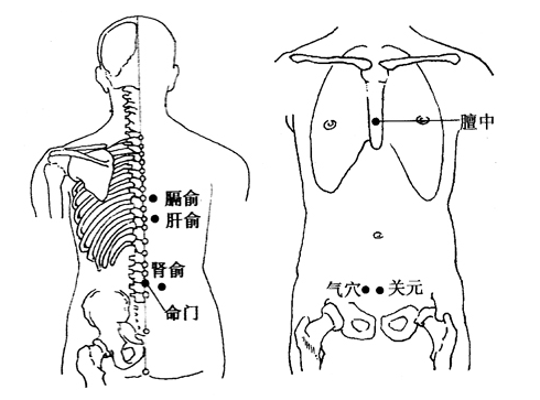 (1)選穴 關元、命門、膈俞、血海、三陰交。