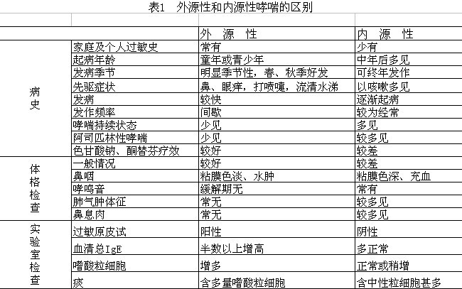 (二)分型 根據(jù)病史、癥狀、體征和實(shí)驗(yàn)室檢查結(jié)果的特點(diǎn),臨床上將哮喘分為外源性哮喘和內(nèi)源性哮喘兩型(表1)。