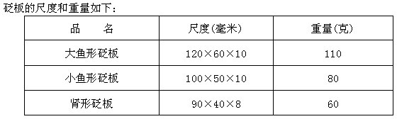 (1)砭鏟:砭鏟長110毫米,寬55毫米,厚10毫米,重130克。適用于刮法和擦法。