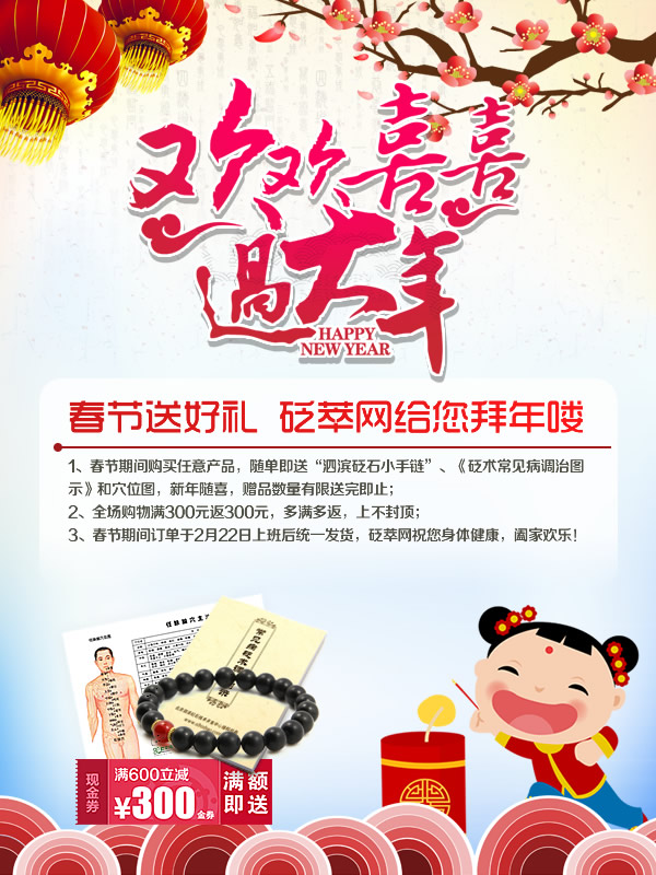 1、春節期間購買任意產品,隨單即送“泗濱砭石小手鏈”、《常見病砭術調治圖示》和穴位圖,新年隨喜,贈品有限,送完即止。