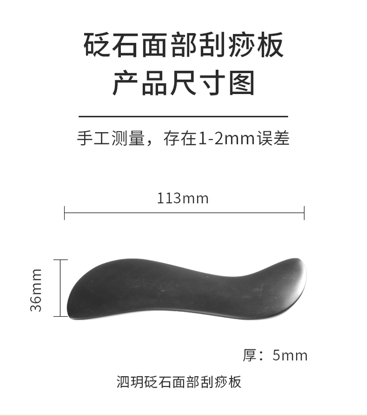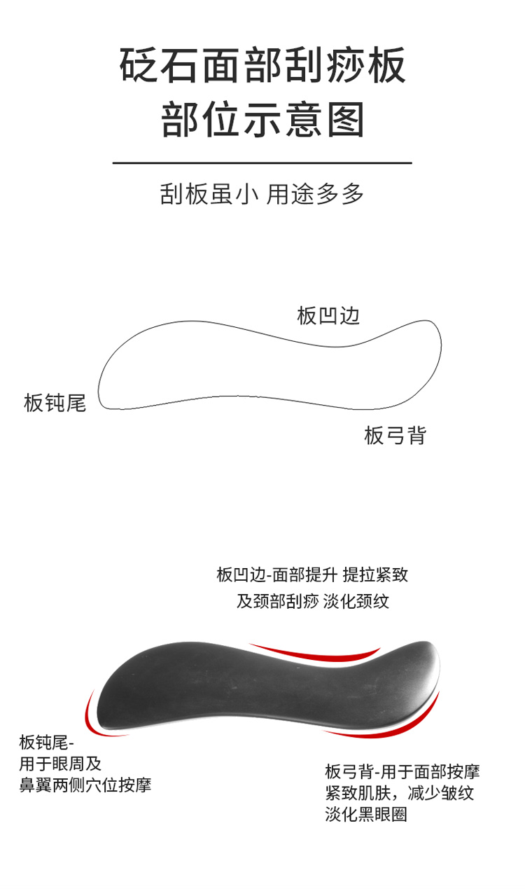 1、刮法:砭板的弧面可用來刮痧,弧度較緩的一側(cè)用于前額及面頰部位的刮拭;另一側(cè)則用于下頜部位的刮拭。