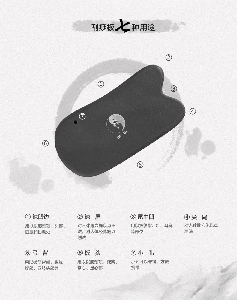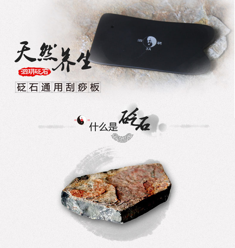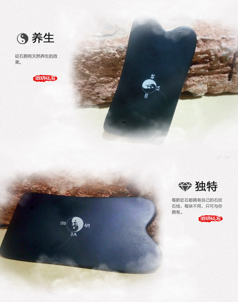 砭石刮痧板,又稱砭板,是用泗濱浮石制成的可用作刮痧的保健器具。其原石為微晶結構,質地光滑細膩,作用于人體有非常舒服的感覺。常用的砭石刮痧板有長方形、魚形、腎形、骨形等。