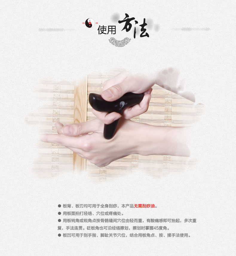 刮擦法:單手握住椎體豎柄,用弧形橫柄在體表行刮法或擦法。橫柄較厚鈍,刮拭皮膚時其力度柔和,因此更適用于皮膚較薄部位的刮拭。