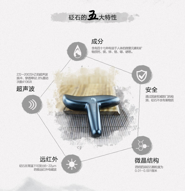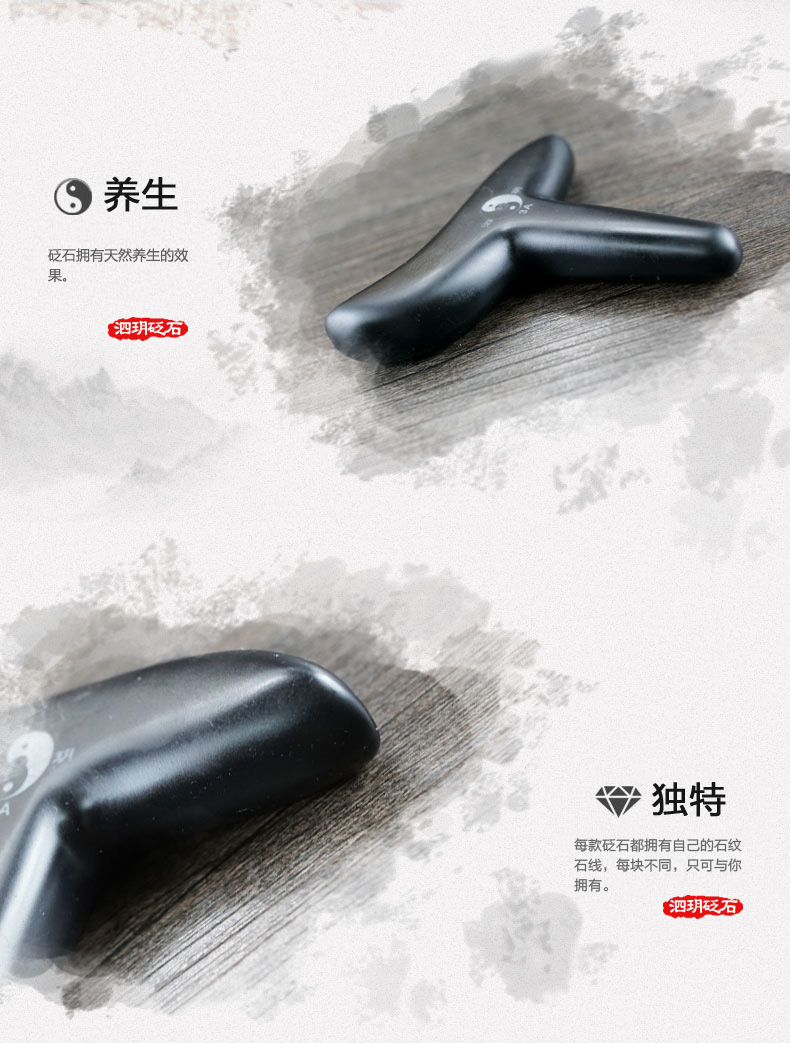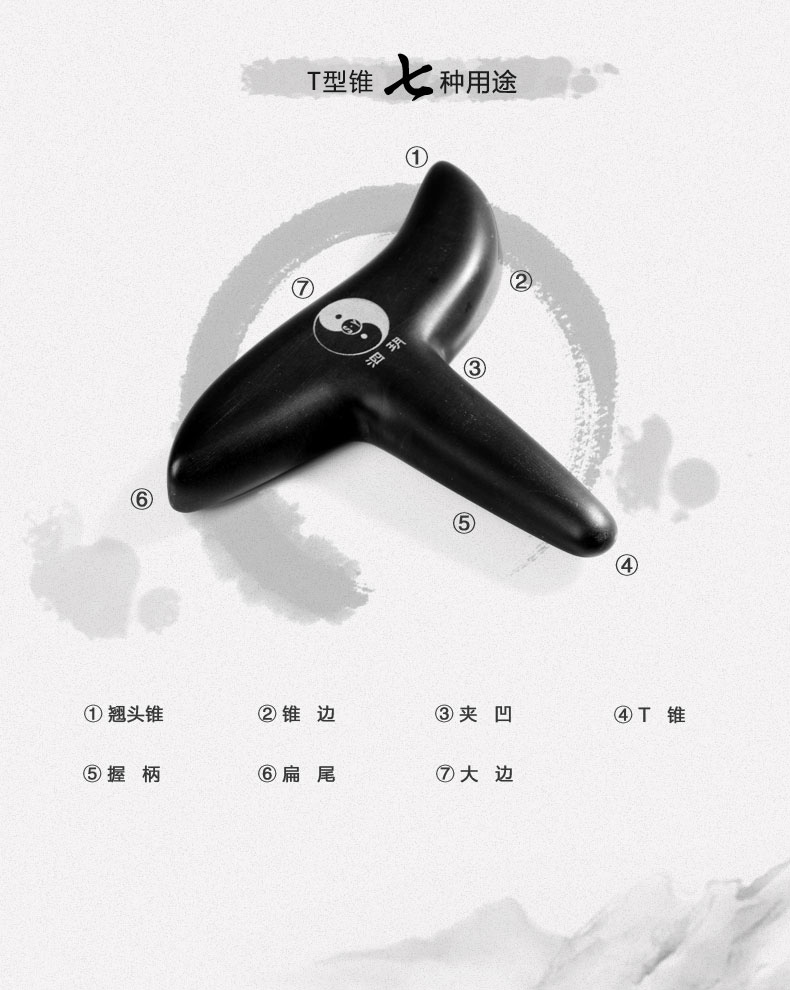 泗濱砭石T型椎,簡稱砭石椎,是由天然泗濱浮石加工而成的養(yǎng)生用具。其外觀呈T型,由椎狀豎柄和弧形橫柄兩部分組成。砭石錐壓力大,刺激性強,用途廣泛,不僅適用于手足部位的穴位保健,還可用于全身各部位的點按刮擦。與點穴椎相比,T型椎拿握更加舒適,操作便捷省力,更符合人體工程學(xué)結(jié)構(gòu)。