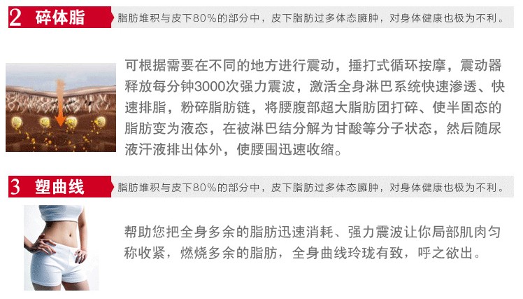 第二大功能:碎體脂。可根據需要在不同地方進行振動,捶打式循環按摩,震動器釋放每分鐘3000次的強力震波,激活全身淋巴系統快速滲透、快速排脂,粉碎脂肪鏈,將腰腹超大脂肪團打碎、使半固態的脂肪變為液態,再被淋巴結分解為甘油及甘酸等分子狀態,然后隨尿液汗液排出體外溶解,使腰圍迅速收縮