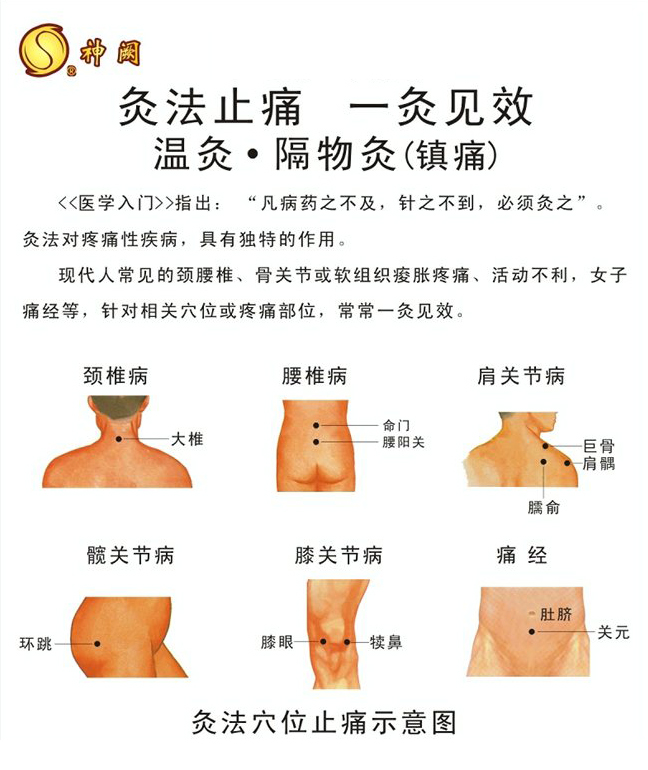溫灸發明人對傳統灸法進行了三十多年的深入研究,在其首創的“肝病中華三環療法”中首先以天灸發泡法代替了傳統的艾灸法,接著發明了溫灸?隔物灸(原名神闕溫灸貼、簡稱隔物灸)等專列產品,使灸法成為醫務人員以及普通老百姓都能規范使用的簡便、高效的醫療手段。 溫灸隔物灸使用時只需打開密封袋,輕輕抖動數次,撕去兩邊膠帖保護紙,或將溫灸隔物灸放入帶松緊的固定袋內,隔物灸工作面(即有神闕商標的一面),對準相關穴位或阿是穴(疼痛部位)即可。使用30分鐘后,溫度可達50℃-60℃,在此溫度范圍可持續恒溫達8小時以上,相對于傳統溫灸500壯的灸量。 經上海中醫藥大學附屬曙光醫院等多家醫院的臨床驗證:溫灸隔物灸對骨關節疾病,特別是頸、腰椎病的治療效果最為明顯。其有養筋榮脈、逐寒祛濕、行氣活血的作用,可以溫經通絡、活血化淤、消癥散結,能明顯緩解頸、腰椎酸脹疼痛,頭痛、頭暈及肢體關節酸痛、強迫體位等癥侯群。常能取得立竿見影的效果,總有效率達96.2%。