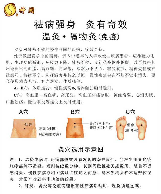 對人體的神經、內分泌免疫、消化、呼吸、循環、泌尿與生殖等系統的功能具有顯著的調節作用,神闕版溫灸隔物灸,隔物灸通過對穴位的持續溫灸,疏通。
